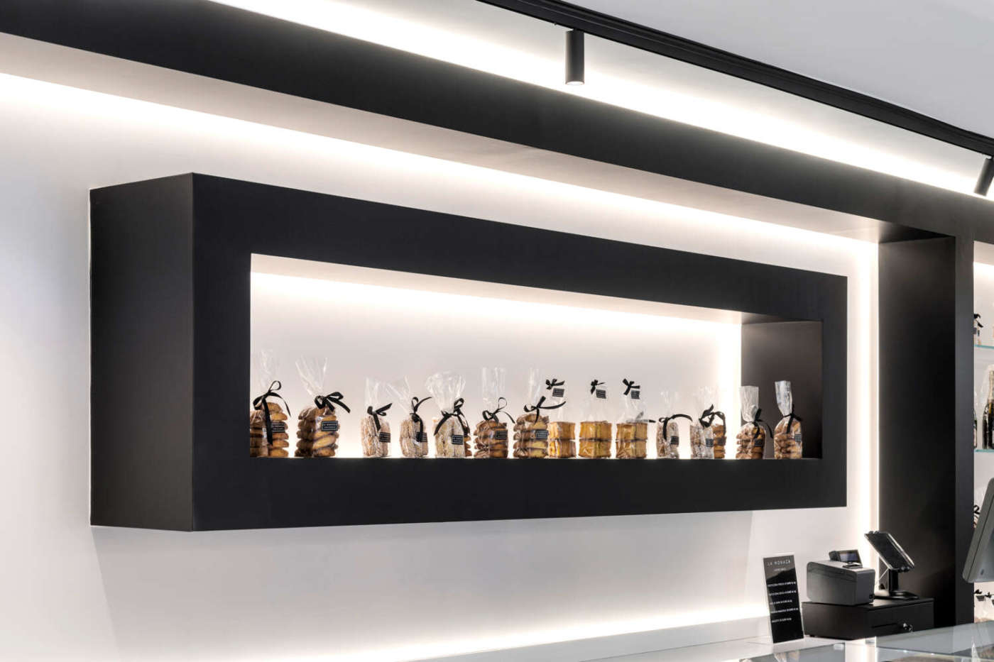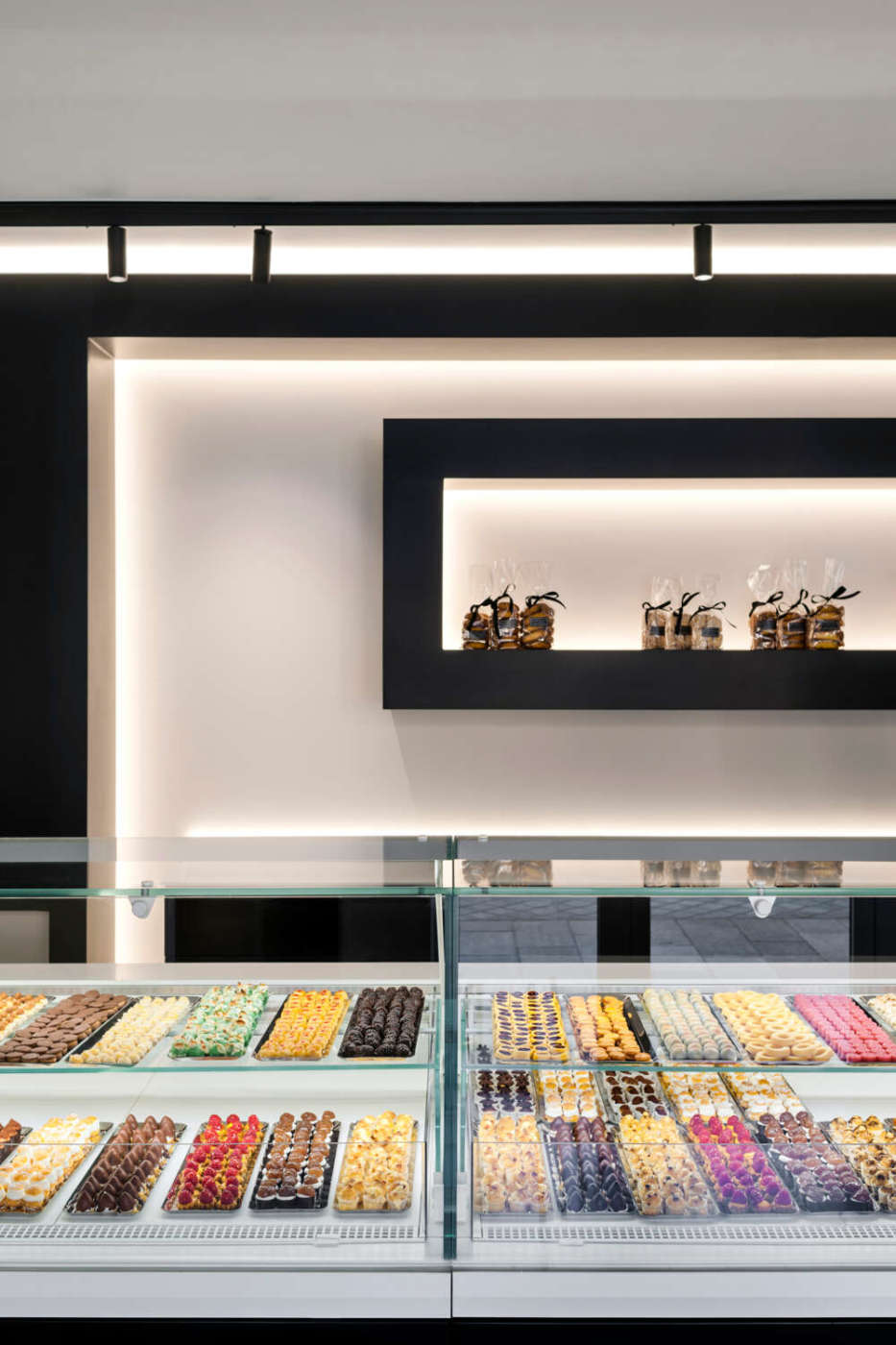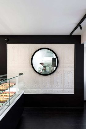 Due soli colori, dunque, per trasformare un piccolo supermercato in un’iconica pasticceria con annesso laboratorio artigianale e un unico elemento, il lungo bancone espositore, per catturare subito l’attenzione dei clienti e minimizzare i dislivelli che circoscrivono l’area vendita in una zona definita e con superficie piuttosto esigua rispetto all’insieme. Il grande banco, un parallelepipedo dai tagli netti con vetrine squadrate, che occupa l’intera larghezza dell’area vendita, mette in evidenza i prodotti di pasticceria dai colori brillanti e variegati dalle forme minute, precise e curate. Sulla parete di fondo prevalgono ancora le linee rigorose che inquadrano il retro banco e gli espositori per le confezioni. Il rigoroso disegno d’insieme bicolor, che offre ai passanti un colpo d’occhio accattivante e una sensazione di pregio e qualità dei prodotti, è addolcito dai decori della bianca carta da parati delle pareti laterali, che richiama quelli in glassa delle torte nuziali. L’effetto scenografico che ne deriva gioca sull’alternanza di luci e ombre anche grazie a un’illuminazione mirata (faretti) o riflessa, sulla scelta di volumi semplici ed essenziali e su finiture morbide al tatto. Dall’area vendita è possibile ammirare l’attività in corso nel laboratorio attraverso il grande oblò vetrato che racconta, con la sua trasparenza dal valore simbolico, la creazione artigianale di ogni prodotto. È tutto quello che serve per rendere questo locale un punto di riferimento importante in città.