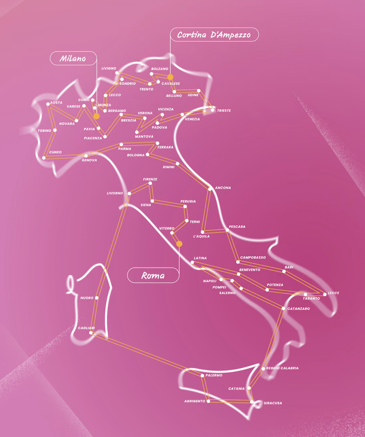 Pescara (2), L’Aquila (3), Ancona (4), Rimini (5), Bologna (6), Ferrara (7), Parma (8), Genova (9), Cuneo (10), Torino (11), Aosta (12), Novara (13), Varese (14), Pavia (15), Piacenza (16), Brescia (17), Verona (18), Mantova (19), Vicenza (20), Padova (21), Venezia (22), Trieste (23), Udine (24), Belluno (25), Cortina d’Ampezzo (26), Bolzano (27), Cavalese (28), Trento (29), Livigno (30), Sondrio (31).