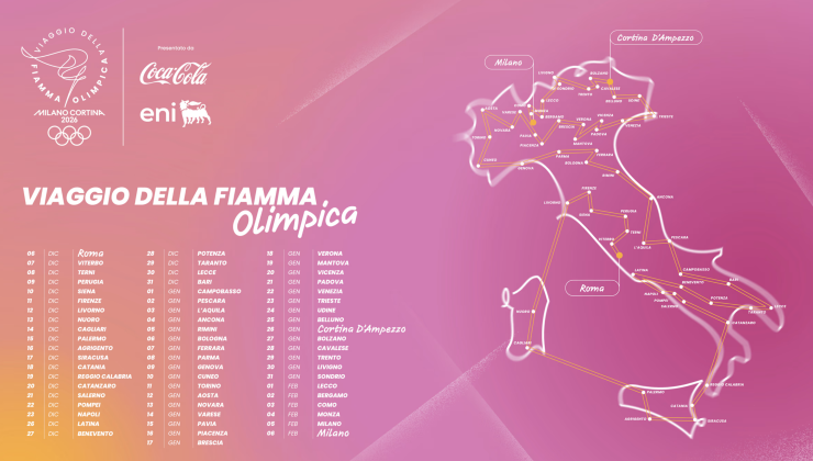 Worlwide Partner dei Giochi Olimpici dal 1928, Coca-Cola Company, attraverso la sua controllata Coca-Cola Italia, ha reso noto nell’apposita conferenza-stampa del 24 novembre, le attivazioni che accompagneranno il Viaggio della Fiamma Olimpica organizzata in concomitanza con i Giochi Olimpici Invernali Milano-Cortina 2026 (6-22 febbraio). In 63 giorni saranno 60 le tappe previste in oltre 300 città di 20 Regioni e 60 Siti Unesco, nel segno dello sport, musica e condivisione.