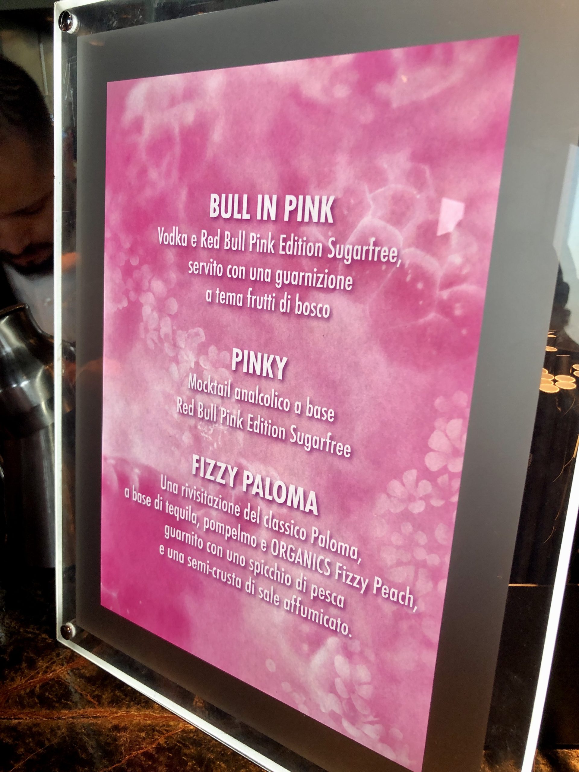 Drink analcolico a base di Red Bull Pink Edition Sugarfree, con latte di mandorla, succo di lime, goccia di acqua ai fiori di arancio, guarnito con foglie di menta.