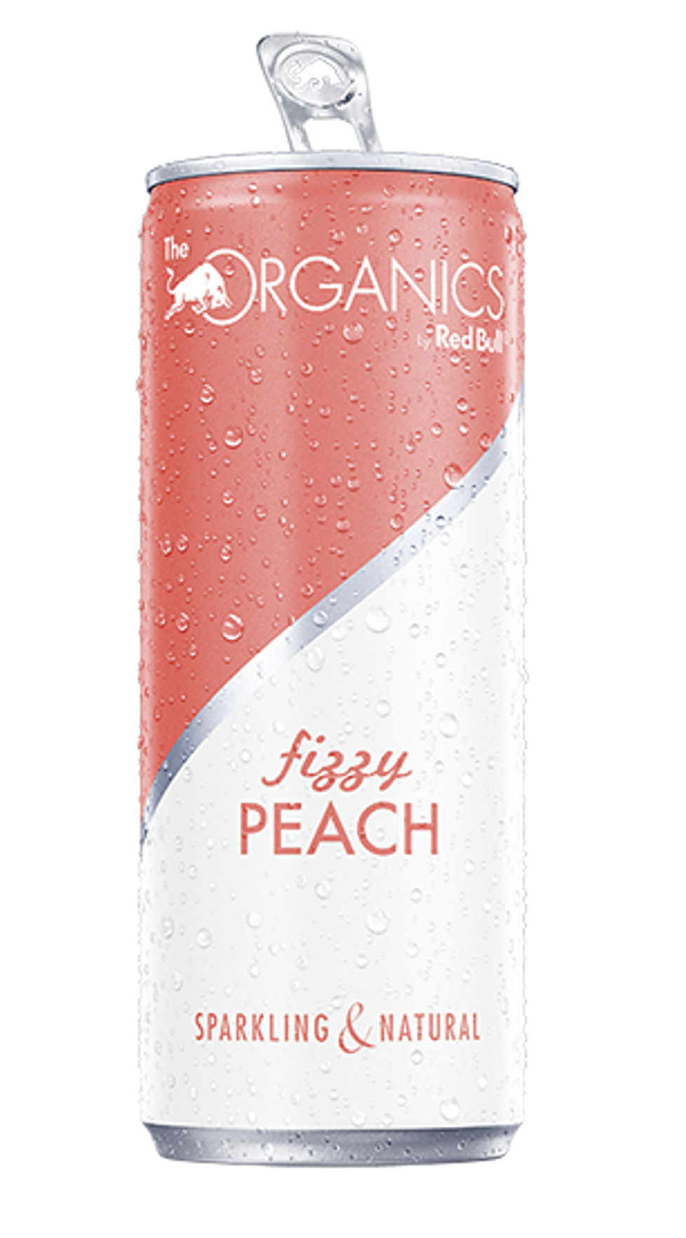 Rivisitazione del classico cocktail messicano Paloma, a base di tequila, succo di pompelmo e The Organics by Red Bull Fizzy Peach (bibita analcolica bio frizzante al gusto di pesca in lattina 25 cl) guarnito con uno spicchio di pesca e una semicrusta di sale affumicato.