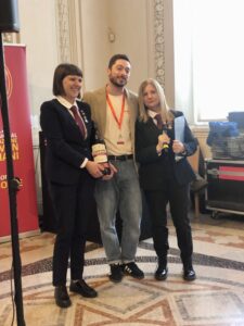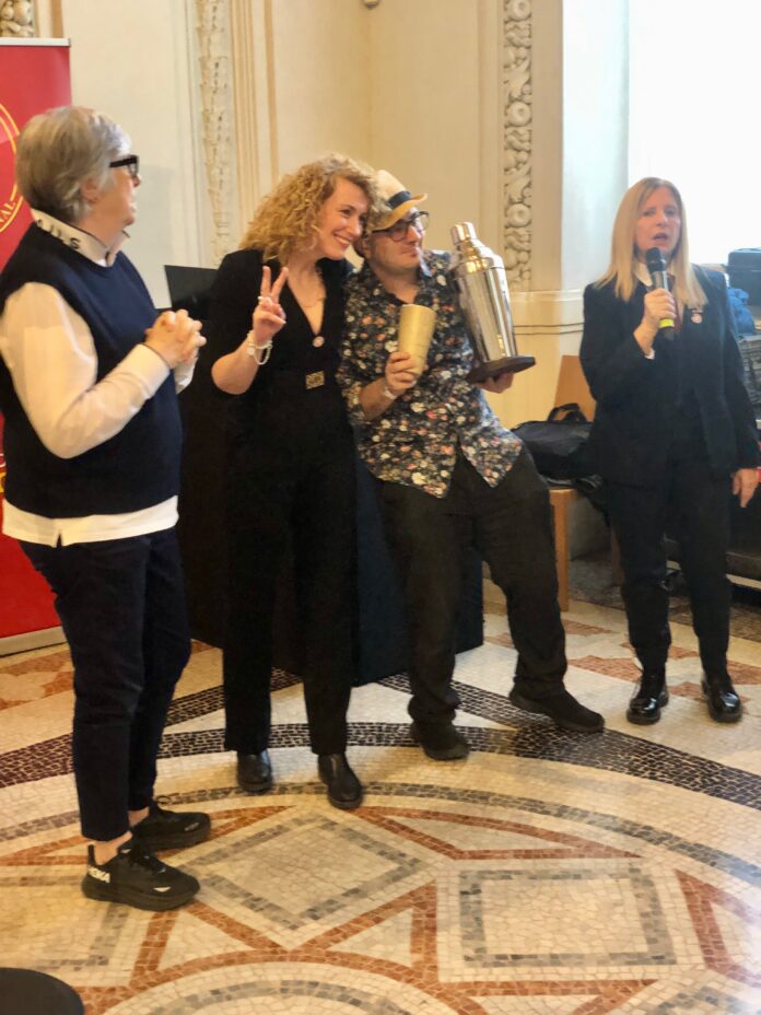 Gabriele Maggioni di Green Wood Bar & Bistrot, Vigevano, premiato con un SuperShaker da Laura Carello, madrina e creatrice del Salone del Vermouth, Marina Milan e Simona Trivellini di Ais, con la ricetta