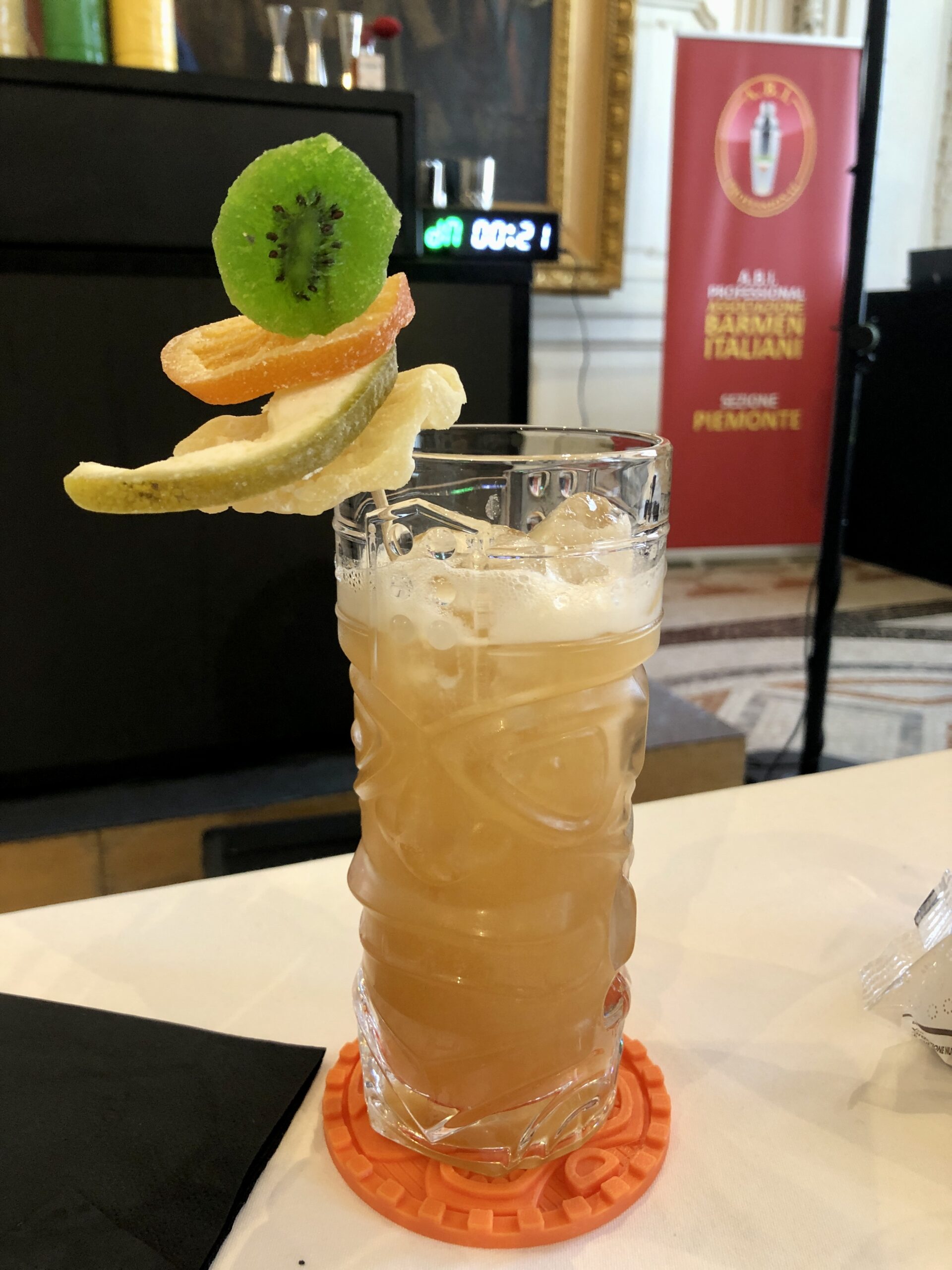 Alla base l’idea originale di creare una ricetta di cocktail tiki (strano perché senza rum!) utilizzando un vermouth estratto a sorpresa tra quelli in portafoglio alle aziende sponsor dell’iniziativa come Bordiga 1888 (novità Ellena), Bonaventura Maschio e Carpano 1786 (F.lli Branca), con il contributo dei mixer cocktail di preparati alla frutta Finest Call & Real e delle guarnizioni di frutta disidratata EB-Eredi Borgnino.