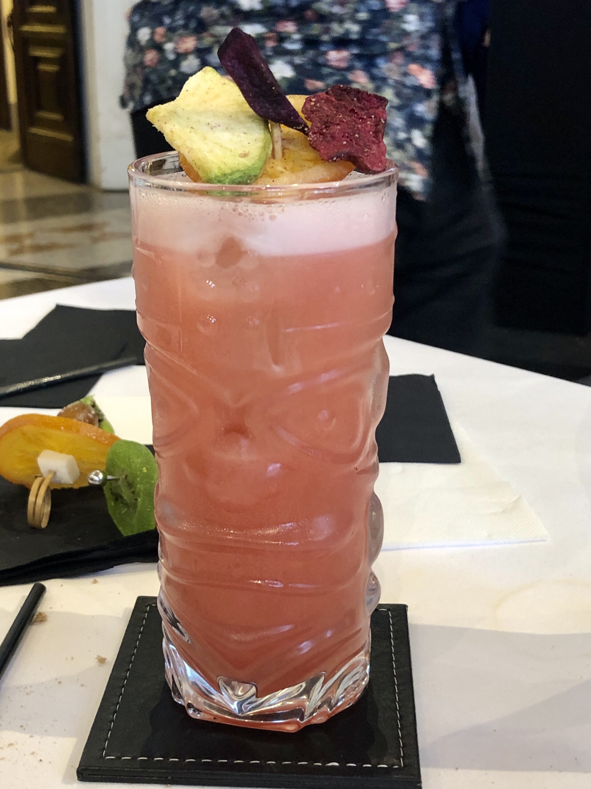 Mixing glass, filtrare in tumbler alto in vetro tiki, guarnito con spiedino di verdure mix come zucchina, carota viola e barbabietola disidratate EB-Eredi Borgnino.