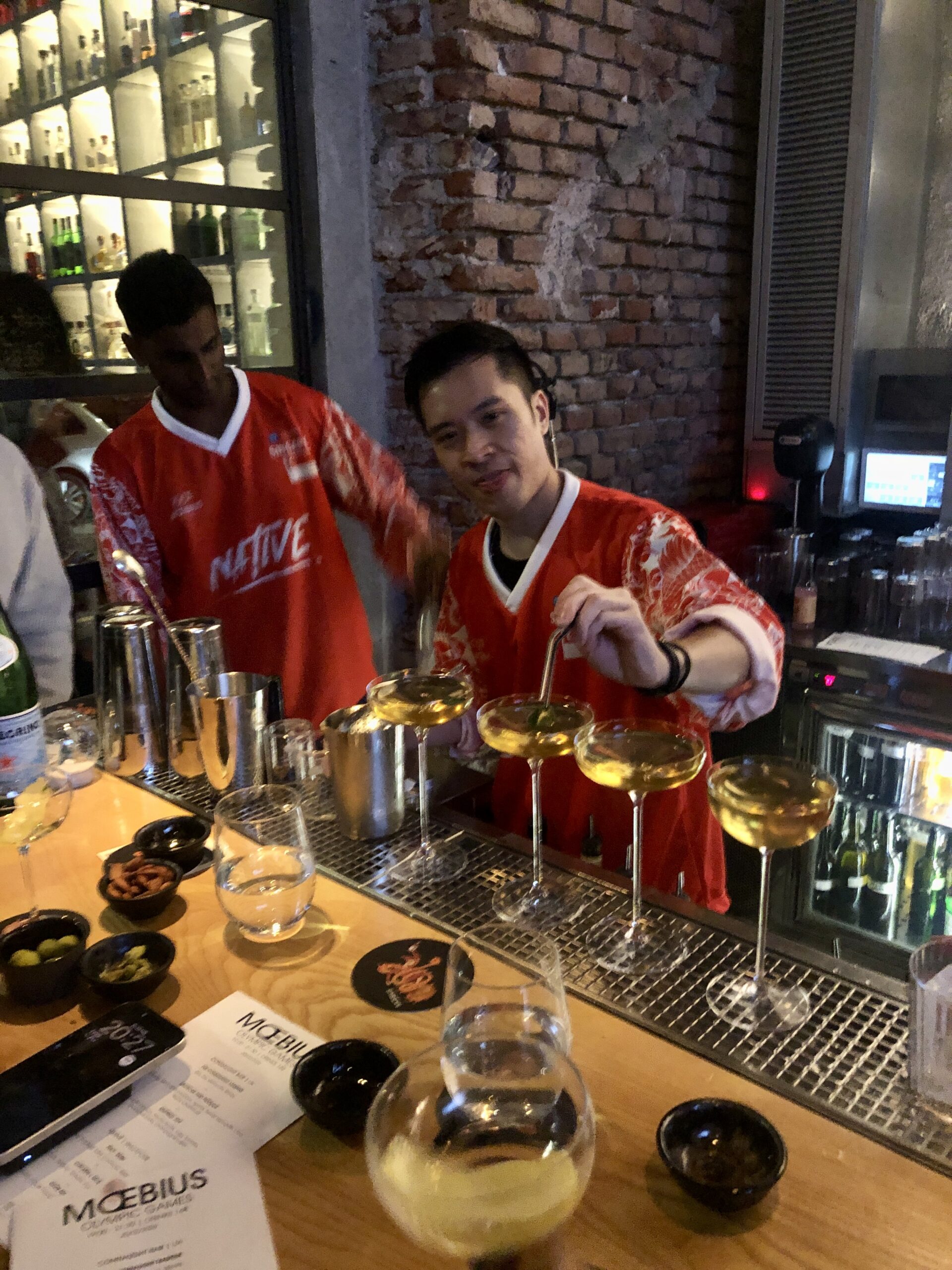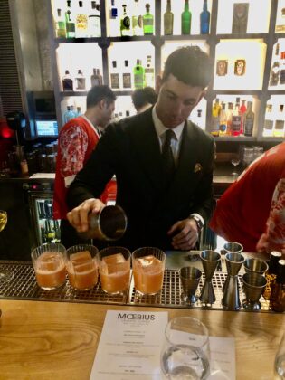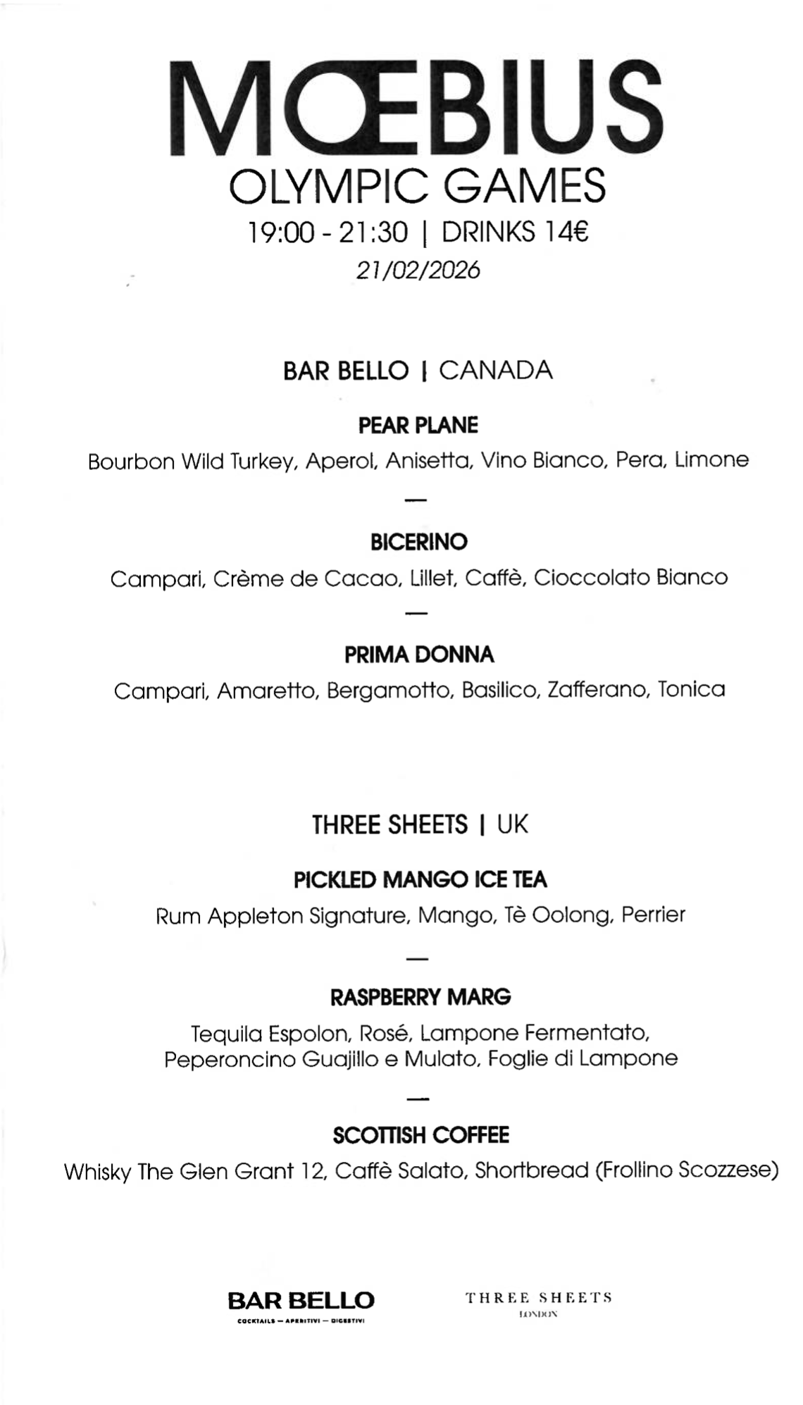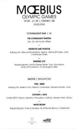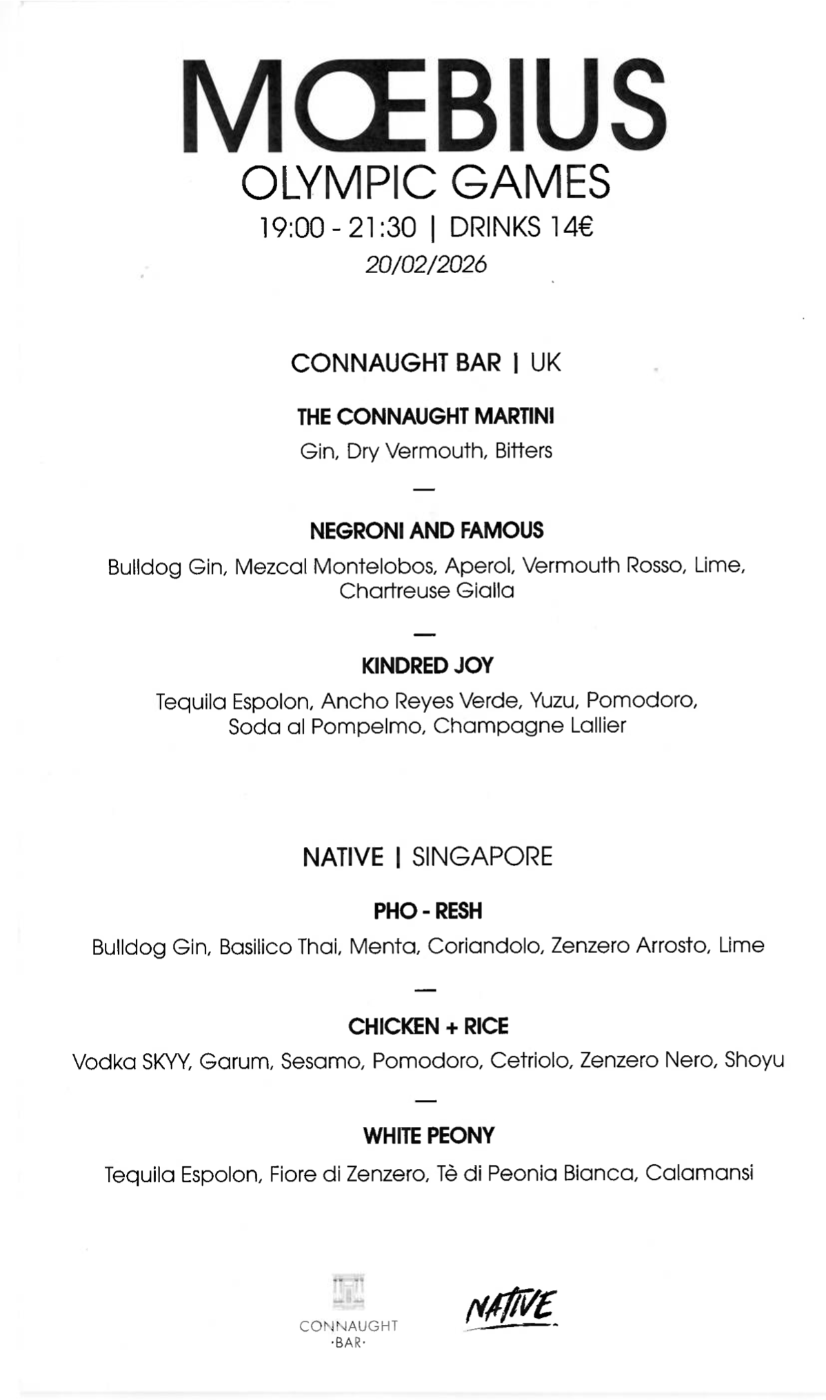 Fresco di un altro prestigioso riconoscimento (7.o posto nella classifica The World’s 50 Best Bars 2025), dopo la Stella Michelin per il ristorante dello chef Enrico Croatti, condotto da Lorenzo Querci, Moebius Milano si conferma a livello internazionale invitando per i suoi Olympic Games i bartender di quattro famosi top cocktail bar: Connaught Bar di Londra, Native di Singapore, Bar Bello di Montreal (Canada) e Three Sheets di Londra. Tra la dozzina di ottimi drink proposti nel corso di due serate, abbiamo scelto di segnalare Negroni and Famous firmato dai bartender Giorgio Bargiani e Andrea Maiolani del Connaught Bar di Londra a base di Bulldog London Dry Gin, Mezcal Montelobos, Aperol, Vermouth Rosso, succo di lime, Chartreuse Gialla, servito in tumbler basso su cubo di ghiaccio.