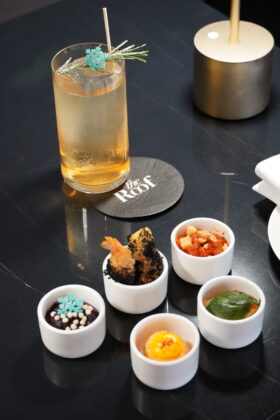 Su un’altra prestigiosa e panoramica terrazza milanese, The Roof Milano Cocktail Bar e Ristorante dell’Hotel dei Cavalieri e Hotel De Square, il barteam Gianluca Zedde ha proposto il cocktail Spicy Olimpia a base di Campari chiarificato, Vermouth Bianco e soda home made allo zenzero, peperoncino fresco e spezie varie, versato in tumbler alto su cubo di ghiaccio e guarnito con un rametto di rosmarino spolverato di zucchero. Cinque gli abbinamenti gastronomici ispirati ai colori dei Cinque Cerchi Olimpici in versione finger food in ciotoline. Cubo di pizza Margherita con salsa verde al basilico; Gambero in tempura con polvere al nero di seppia; Riso giallo allo zafferano passato al salto con cremoso di Gorgonzola Top; Pappa al Pomodoro; Crema di carote viola.