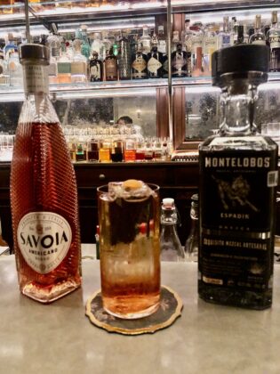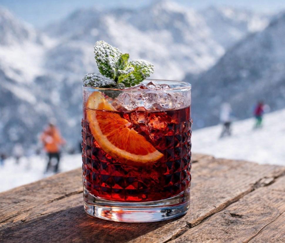 Negroni Alpino (America): 3 cl Cortina Mountain Gin, 3 cl Savoia Americano Rosso Vermouth, 3 cl Bordiga Genepì Secco, versato in tumbler basso.