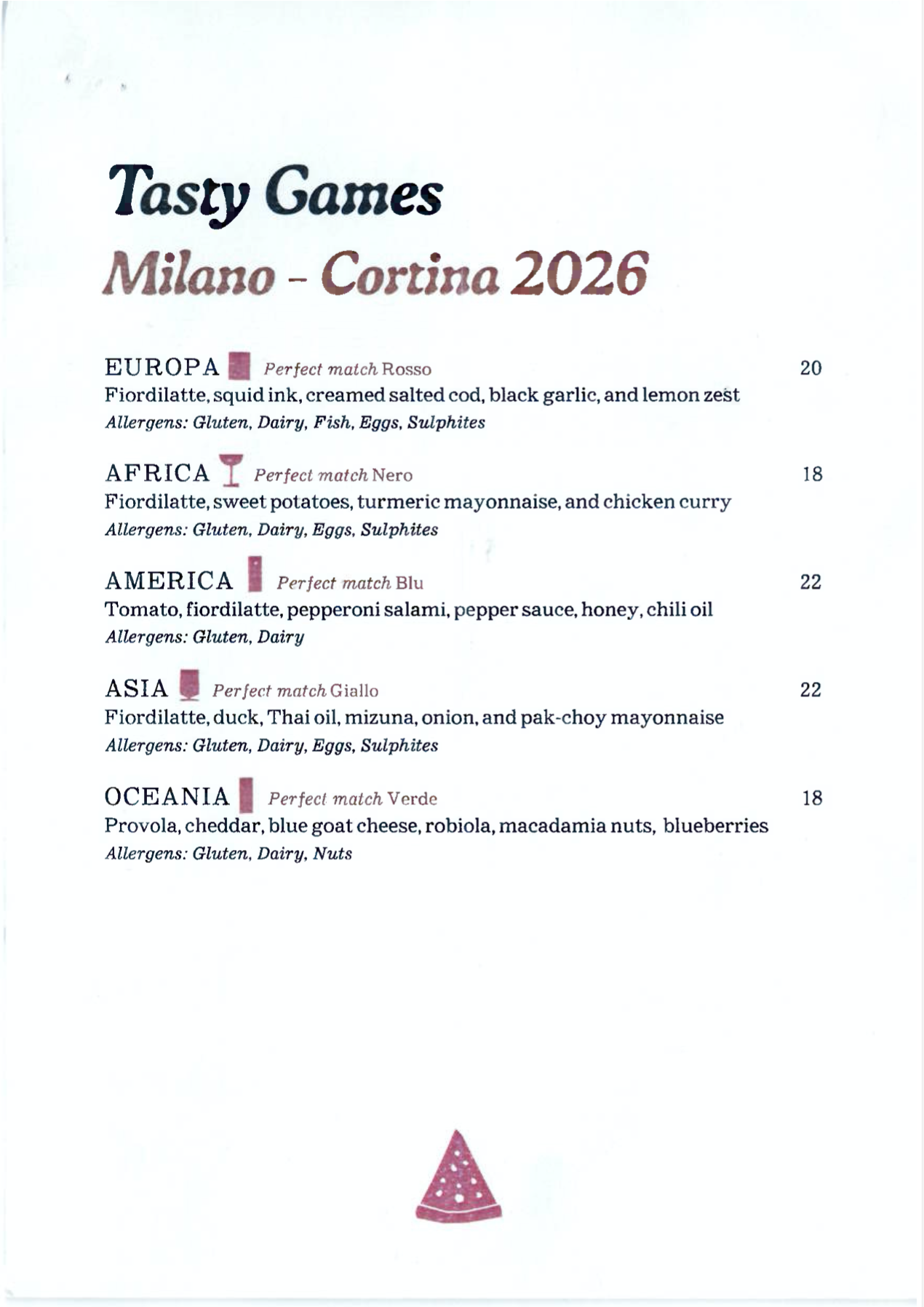 Famoso per gli abbinamenti “americani” pizza & cocktail, gestito dal barmanager Edris Al Malat, Dry Milano ha messo a punto la drink & food list Tasty Games (5 cocktail e 5 pizze) ispirata ai Cinque Cerchi Olimpici. Citiamo uno degli abbinamenti più “golosi” come Giallo (Asia) con Roku The Japanese Craft Gin, Chartreuse gialla, succo di lime, Maraschino e pineapple yogurt, servito con la Pizza farcita al pomodoro, fiordilatte, pepperoni salami, honey, chili oil, foglie di basilico.