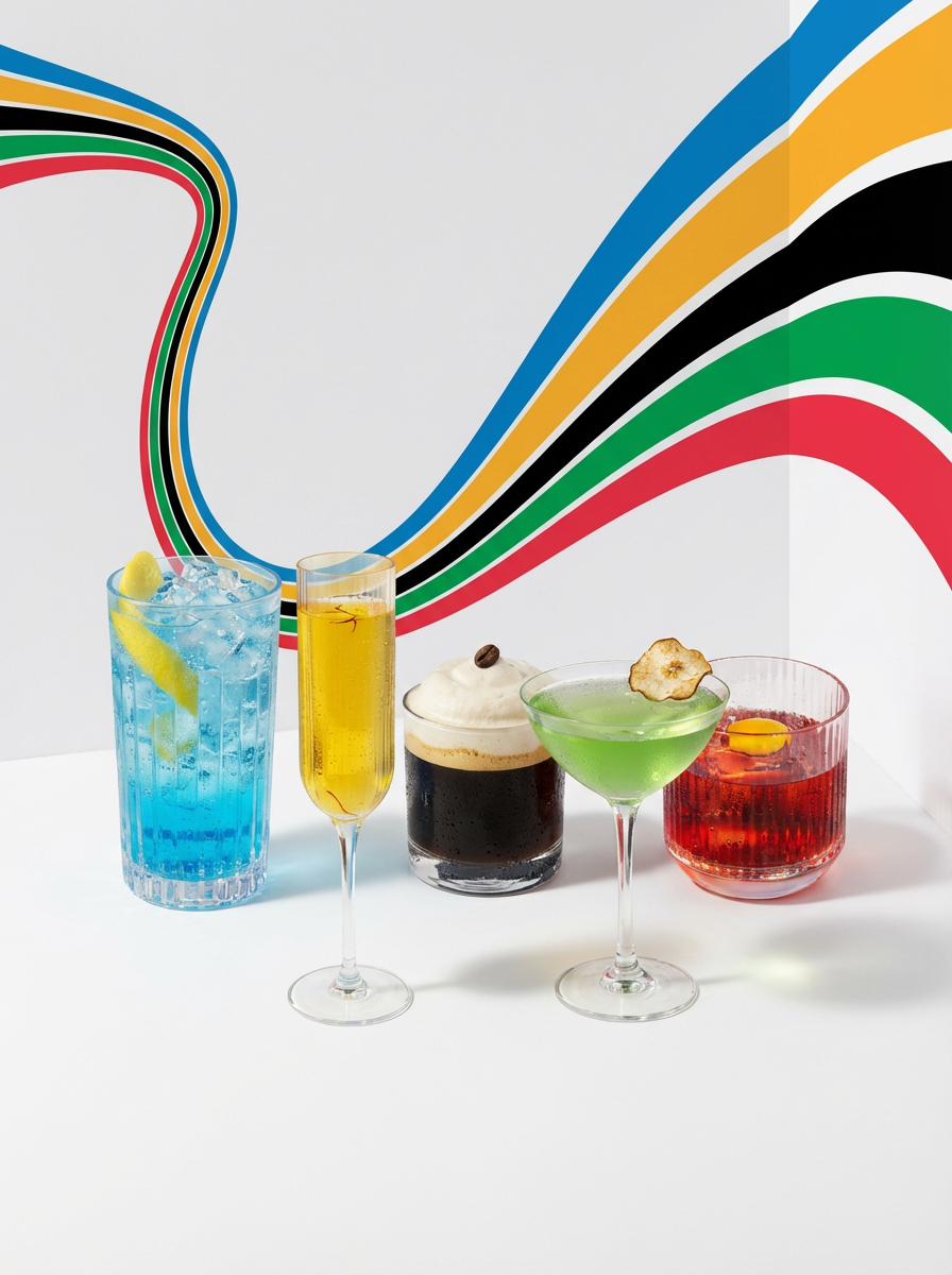 Consulente e top mixologist del progetto nonsolocockails.com, Mattia Pastori si è ispirato ai colori dei Cinque Cerchi Olimpici (che rappresentano i cinque continenti) per altrettante diverse proposte.