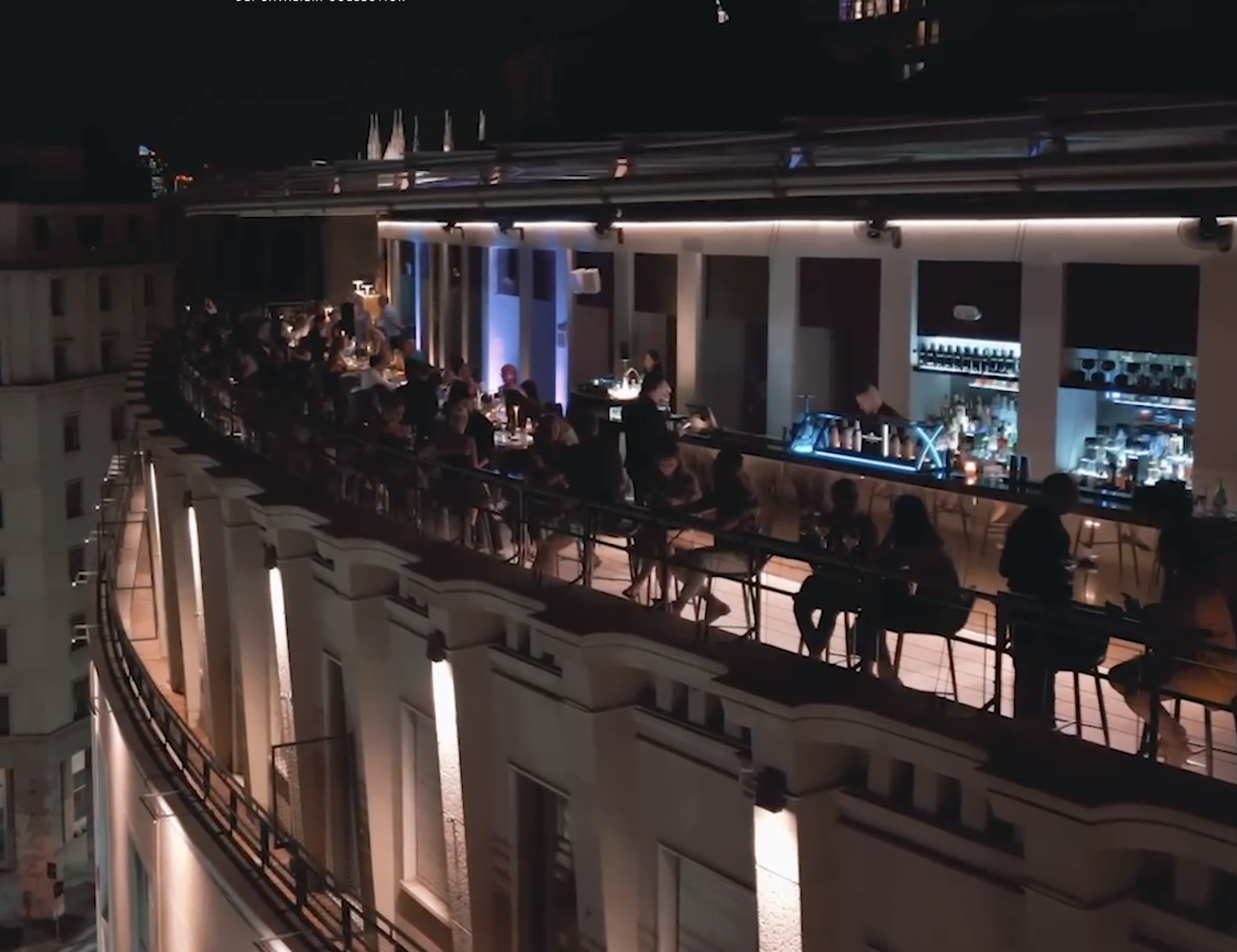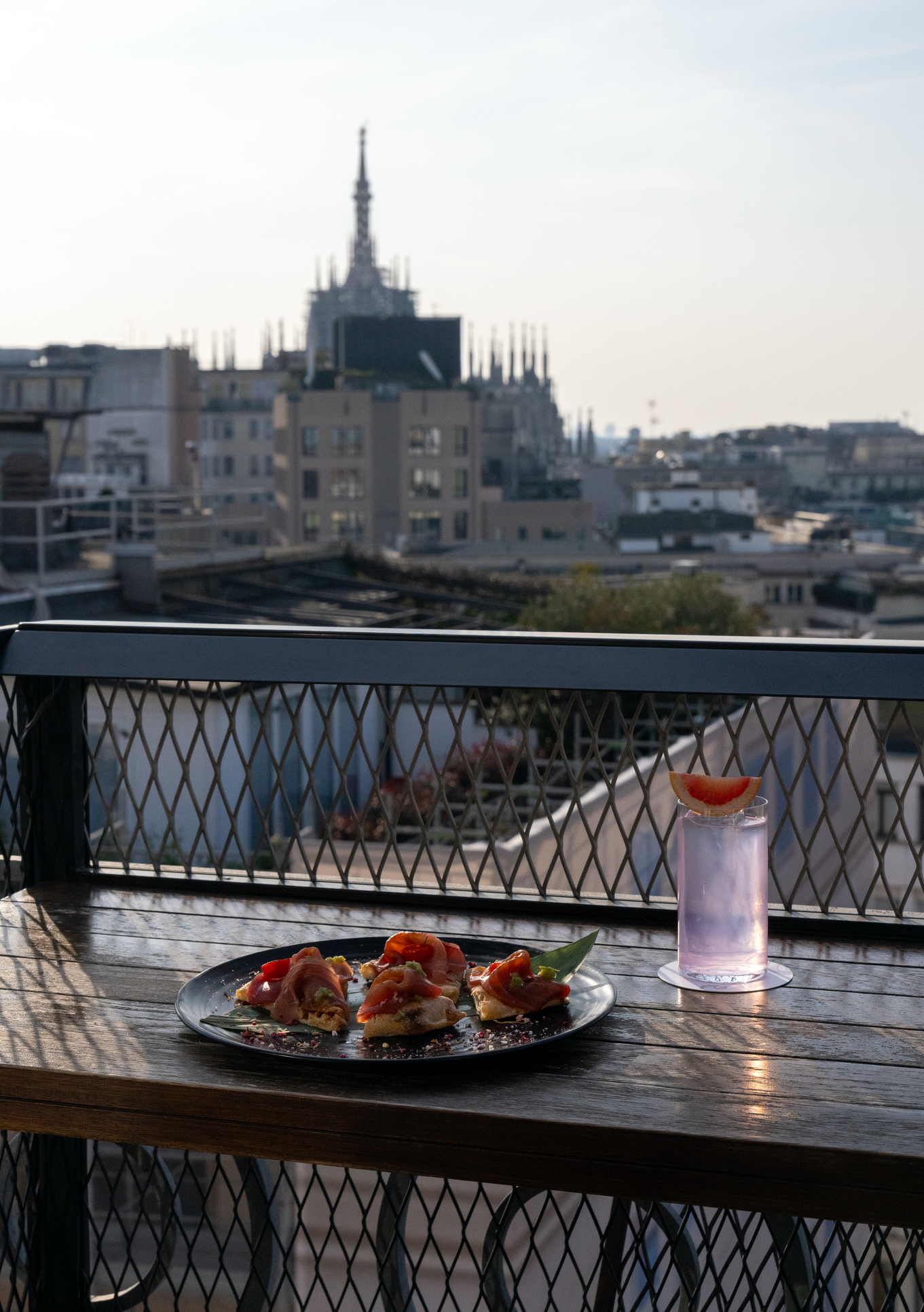 Scenico rooftop al decimo piano (dalla quale spesso si vede la schiera delle Alpi lombarde), il terzo locale con insegna A’Riccione dei fratelli abruzzesi Dante e Giuseppe Di Paolo, A’Riccione Terrazza 12 ha scelto di proporre tre cocktail dal barmanager Jimmy Saka e dei bartender Alfred Betun ed Erik Quarantani abbinandoli a tre piatti dello chef Marco Fossati.