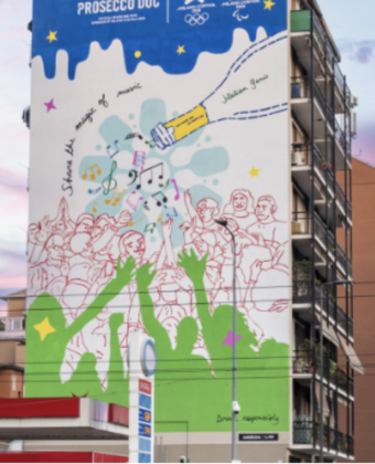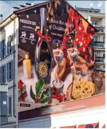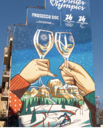 Vino spumante italiano più prodotto ed esportato nel mondo con una produzione di oltre 616 milioni di bottiglie di 346 aziende, il Consorzio di Tutela del Prosecco Doc è stato Official Sparling Wine dell’evento olimpico invernale. Oltre che per i brindisi alle vittorie degli atleti nei vari Olympic Lounge, il Consorzio Prosecco Doc ha scelto una promozione di grande impatto visivo facendo eseguire sette grandi murales sui vari palazzi milanesi, in collaborazione con la start up Outdoora specializzata in SocialArtvertising. Punto di riferimento milanese è stato il Prosecco Doc Spakling Hub di piazza San Babila.