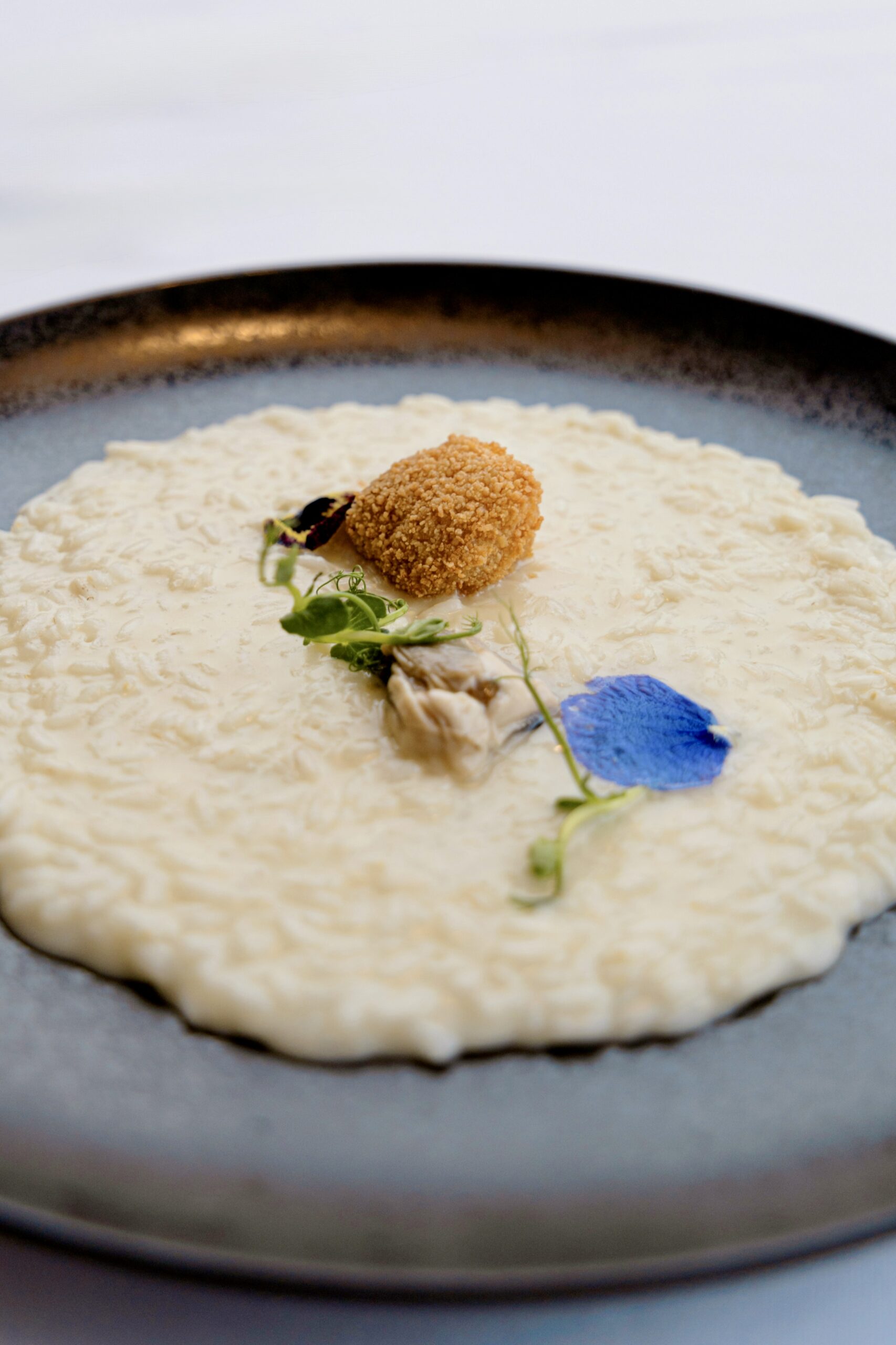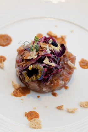Abbinamenti mare-monti con Tartare di tonno con lime, briciole di pane, crauti viola e salsat rentina Bozner; Risotto A’R Milano-Cortina bagnato con infuso al pino mugo, mantecato con burro di malga, guarnito con un’ostrica; Gamberoni alla brace serviti con radicchio ciotto a bassa temperatura in agrodolce, ristretto di crostacei e burro di malga alle erbe alpine.