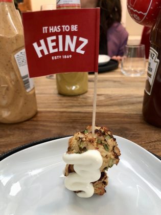 Spiedini di polpettine di pollo aromatizzate con zenzero e cipollotto, passate al forno, guarnite con Heinz Mayo.