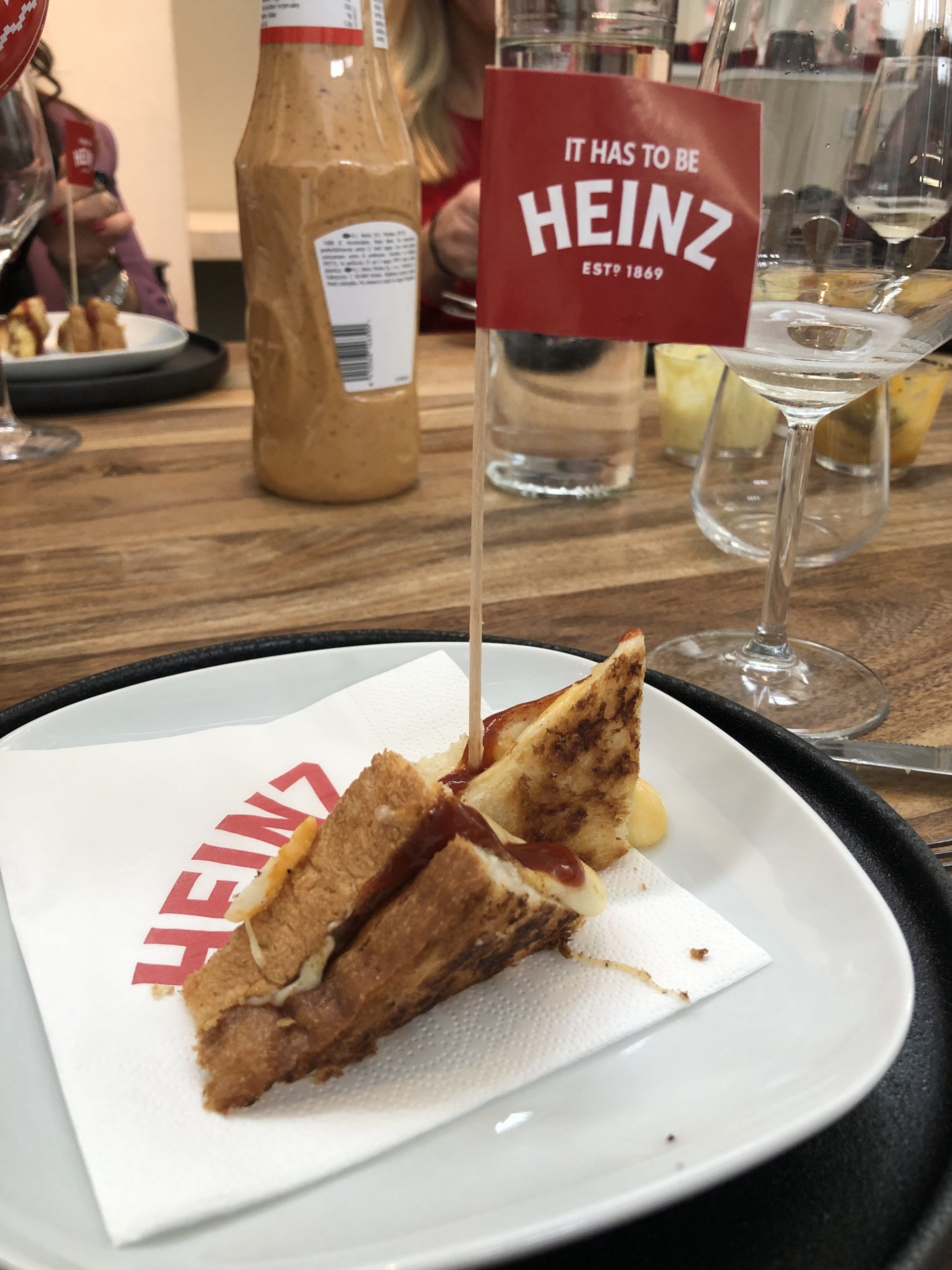 Tranci di toast farciti con fette di Fontina e cheddar, conditi salsa Heinz Firecracker e senape, passati su piastra.
