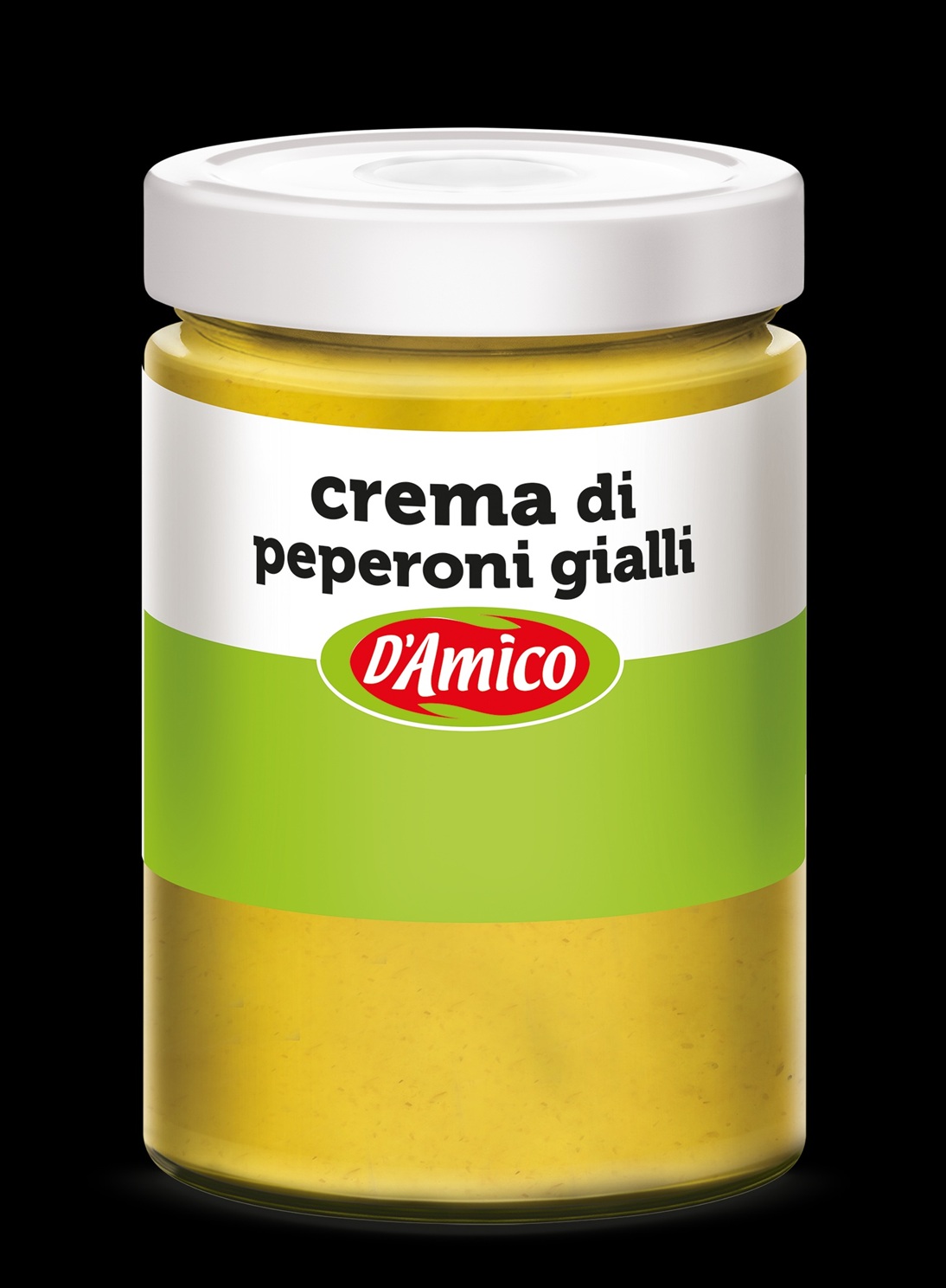 Realizzata con peperoni gialli, capperi, alici e menta, la Crema di Peperoni Gialli è una crema dal gusto ricco e intenso capace di esaltare il sapore di ogni preparazione e creare suggestivi effetti cromatici nei piatti. Utilizzabile sia a caldo sia a freddo, è ideale per finger food con gamberi o burratina, per preparazioni di mare, ma anche per pizze gourmet, dove va aggiunta a fine cottura.