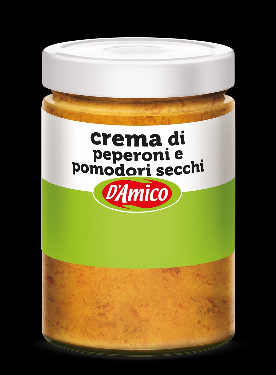 Dal colore arancione chiaro e dal gusto deciso, la Crema di Peperoni e Pomodori Secchi nasce dall’unione di peperoni e pomodori secchi a capperi, acciughe, frutta secca, pecorino e grana padano. Una ricetta che racchiude tutta la ricchezza e l’intensità della cucina mediterranea e ideale per bruschette e finger food, ma che si abbina a meraviglia a stracciatella, alici fritte o gamberi croccanti ed è anche ottima per arricchire primi piatti o guarnire pizze gourmet.