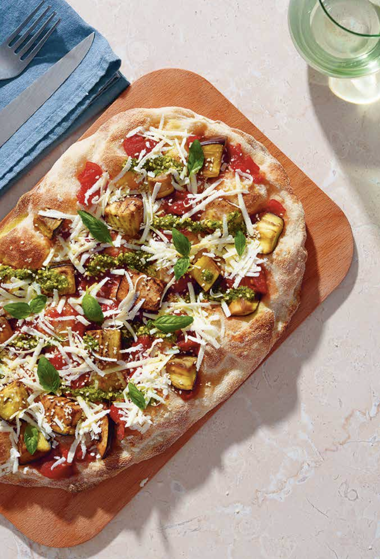 Distribuire la base di pomodoro al miso e cuocere fino a doratura. A fine cottura condire la pinsa con le melanzane alla soia, pesto di basilico e abbondante ricotta di mandorle grattugiata.