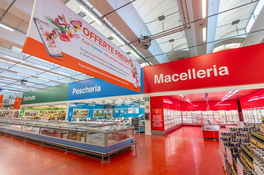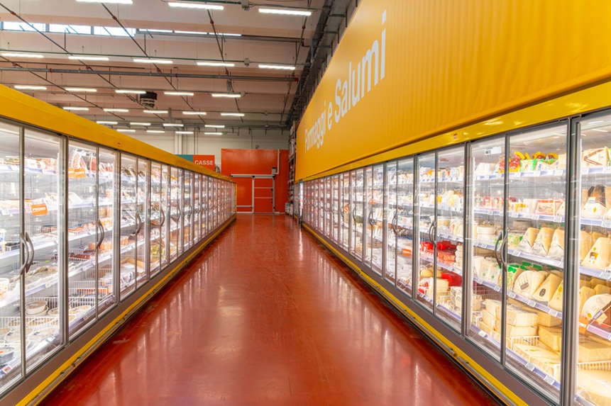 Pià nel dettaglio, la riqualificazione ha portato all’ampliamento delle superfici refrigerate, con particolare attenzione ai prodotti deperibili. La macelleria si è arricchita di banchi espositivi a libero accesso e un’area dedicata alla frollatura Dry-Aged. Completamente rivisto anche il reparto ittico, dove è stata potenziata la zona surgelati e l’intera sezione ortofrutta che ora beneficia di un sistema di refrigerazione esteso.