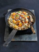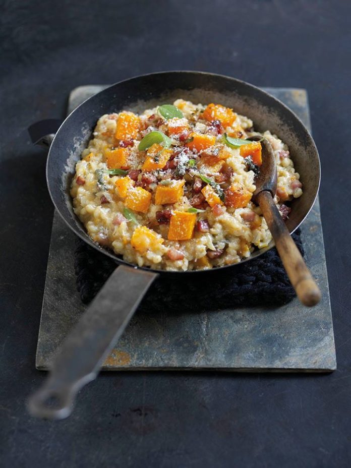 - Ungere una teglia con un filo d’olio e disporre la zucca, la patata, la pancetta e la salvia. Cuocere in forno a 200 °C per circa 20 minuti. In una pentola versare il restante olio e soffriggere la cipolla, poi aggiungere il riso e tostare bene. Sfumare con il vino bianco e cuocere per 10 minuti aggiungendo man mano il brodo vegetale. A questo punto, aggiungere al riso le verdure e la pancetta e terminare la cottura. Togliere dal fuoco e mantecare con il Parmigiano Reggiano. Servire ben caldo guarnendo a piacere con qualche cubetto di pancetta e foglie di salvia.