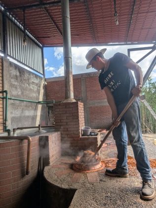 La materia prima è 100% Agave Espadín, selezionata dalle valli di Oaxaca, che vengono affumicate per 4-6 giorni in forni scavati nei suoli vulcanici presenti nella zona. Dopo l’affumicatura, le piñas raffreddano per 24 ore prima di essere macinate con una ruota tahona, ancora oggi trainata da cavalli. Il succo e le fibre vengono posti in tini di legno e lasciati fermentare in modo naturale da 4 a 8 giorni, a seconda della stagione e della temperatura, per concludere il processo con una doppia distillazione in alambicchi di rame.