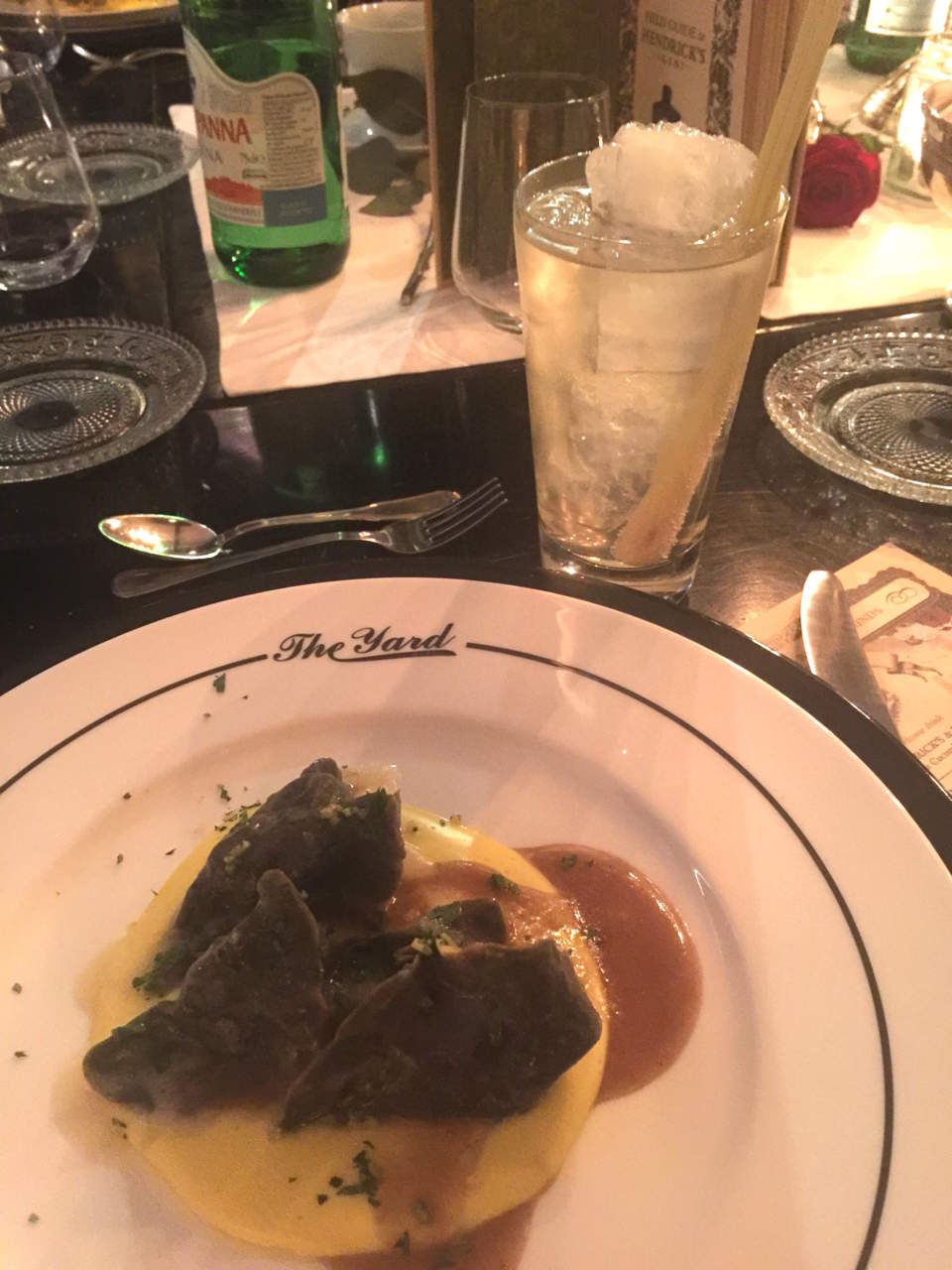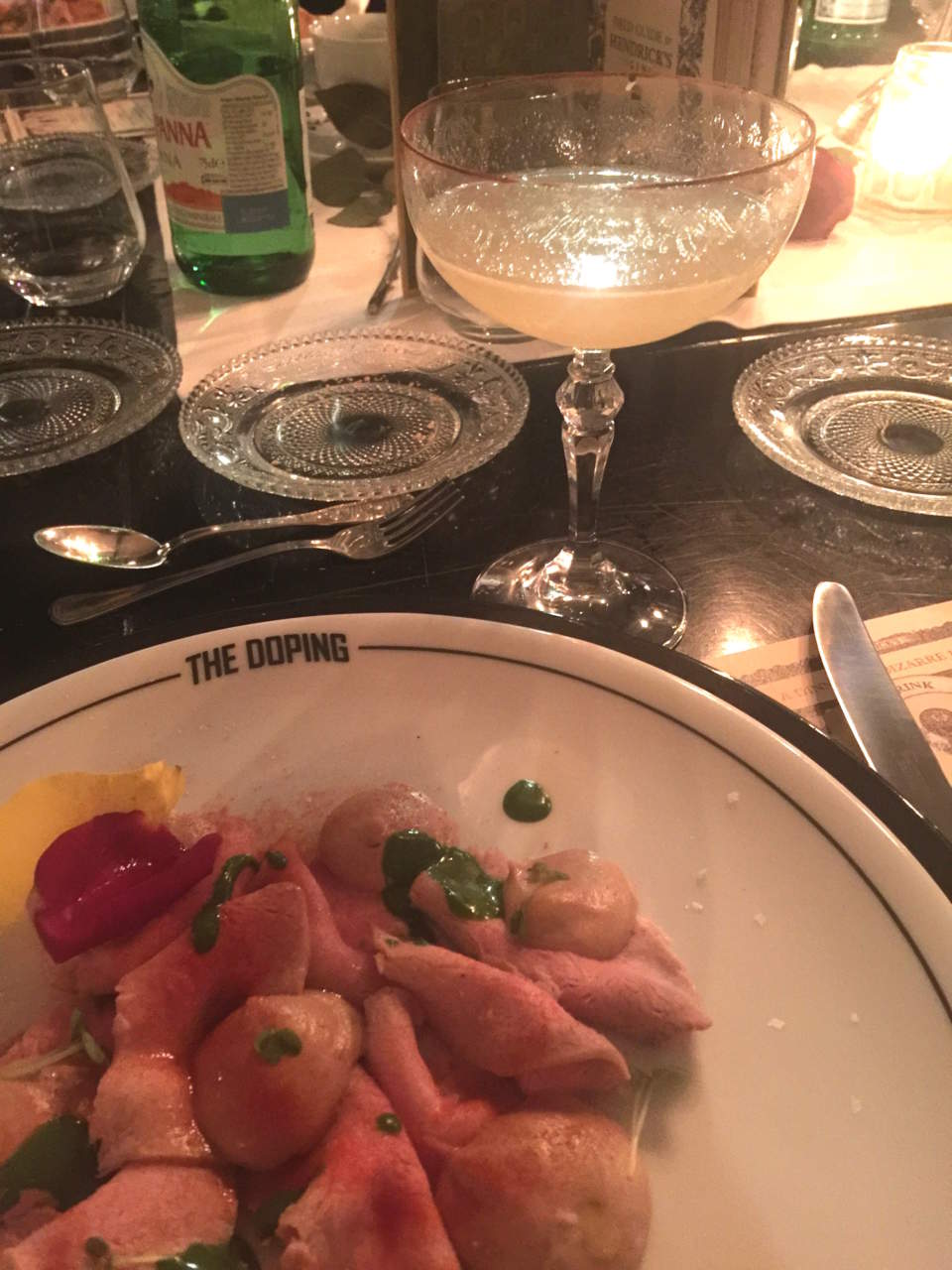 Ravioli di grano arso all'ossobuco, crema di parmigiano allo zafferano e gremolada abbinati con Madam D (Hendrick's Gin, succo yuzu, cordiale di Champagne).