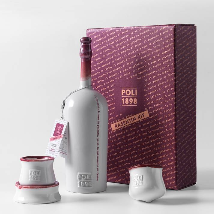 A comporre il Rasentin kit una bottiglia in ceramica che contiene una selezione speciale di Grappa Bassano 24 Carati (alc 40%), ottenuta da vinacce di cuvée di vitigni aromatici del vicentino, distillate artigianalmente con alambicco in rame con caldaiette a vapore e fatta maturare in rovere nelle cantine sotterranee di Poli Distillerie. Ad affiancarla due originali tazzine piroettanti, sempre in ceramica, ideate da Jacopo Poli, alla guida dell'azienda di famiglia, nelle quali dare vita all’antico rituale. A realizzare la bottiglia e le tazzine, gli artigiani di Stylnove Ceramiche, azienda di Nove specializzata nella ceramica artistica, che hanno tradotto in realtà le idee dei giovani designer. Inoltre, ogni pezzo è fatto a mano, rendendo ogni kit una realizzazione unica: vere opere d’arte che saranno commercializzate esclusivamente presso i punti vendita del Poli Museo della Grappa a Schiavon e a Bassano del Grappa.