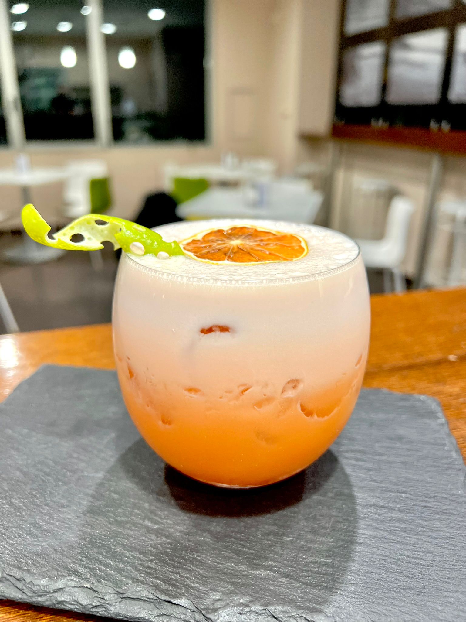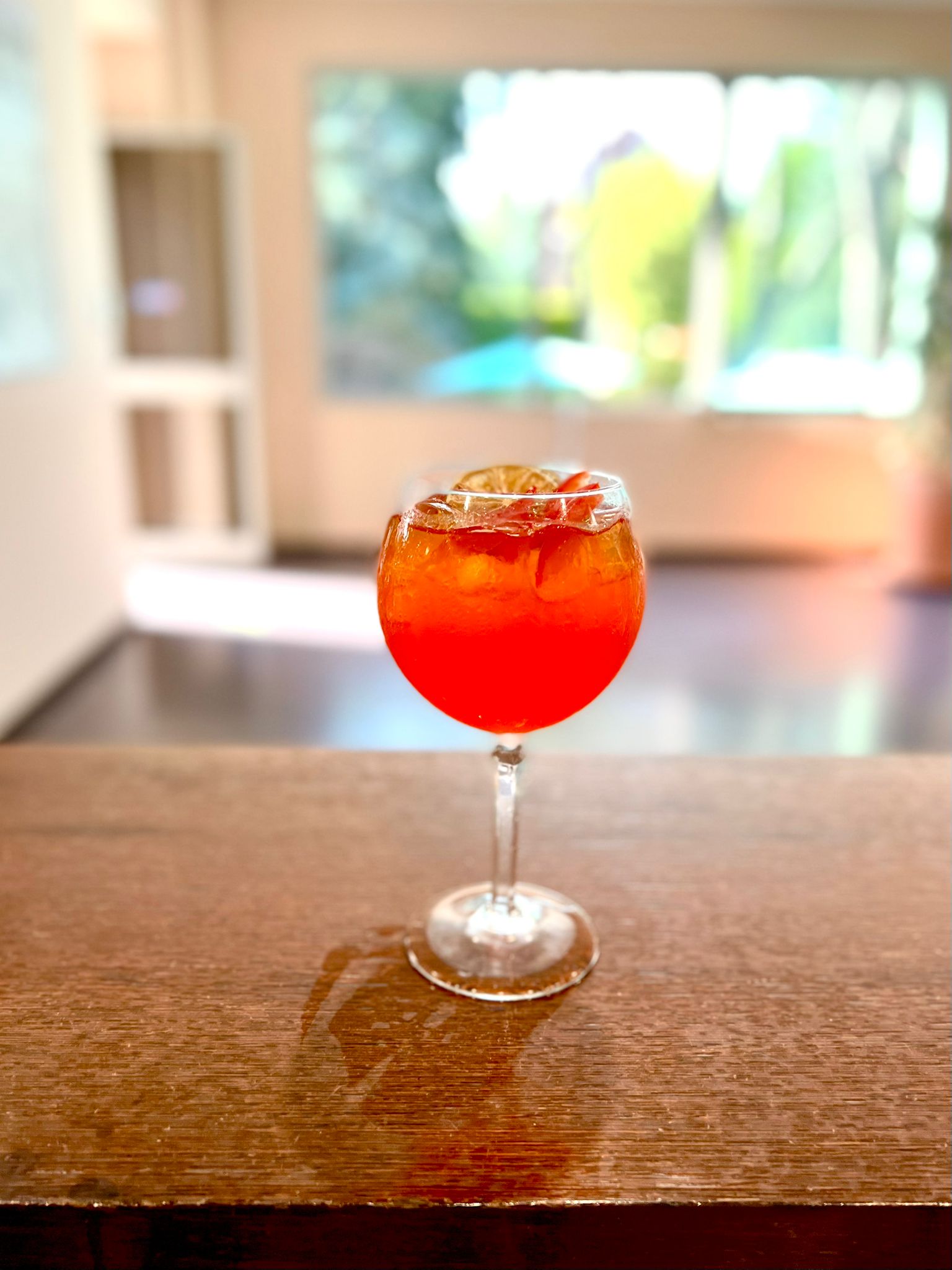 Cambiando decisamente stile, Alessi propone anche un cocktail shakerato dai richiami tropicali. Nel suo Carribean Spirit troviamo infatti il Rum Mathilda 7 anni di Magnoberta (4,5 cl), di nuovo l'Apertonik (4 cl), il lime (1,5 cl), lo sciroppo al Passion Fruit (2 cl), qualche goccia di soluzione salina, un emulsionante per la texture e una doppia shakerata, una a secco e una con ghiaccio, per creare la splendida foam on top che caratterizza questo drink.