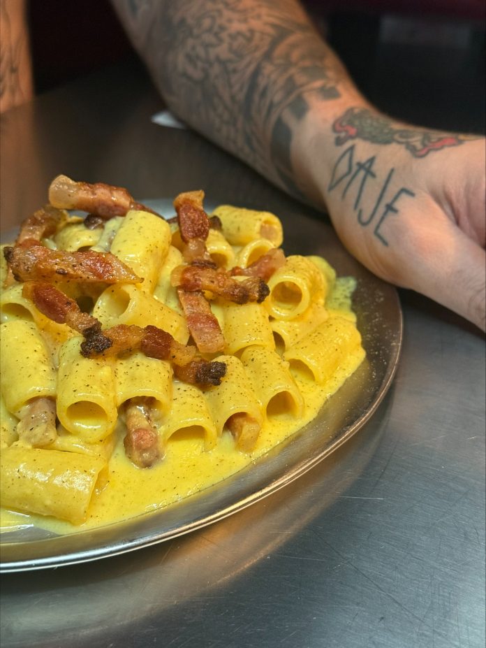 Che vuol dire Fame chimica? Abbiamo già fatto cenno alla Carbonara, che Tuzzi definisce "educata". «Non è 100% pecorino, perché abbiamo pensato che dopo una cert'ora fosse il caso di renderla meno sapida addolcendola con il Parmigiano». Poi ci sono i fritti, come l'Iconico, che è un supplì dalle dimensioni importanti (il più richiesto è il classico), le Patatine fritte, anche queste semplici o condite, i Bandidos de pollo (ovvero gli straccetti di pollo impanati e fritti). E ancora 4 primi, fra cui gli immortali Ajo ojo e peperoncino e i Tortellini panna, prosciutto e piselli. Hamburger e Smash e fra i dolci un dirtyssimo Tiramisù con la nutella.