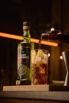 60 ml Clan Campbell The Noble, 10 ml succo di lime fresco, top di Cola