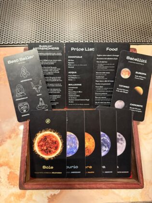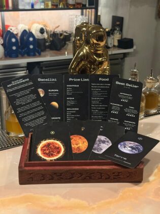 Hanno guardato al cielo, invece, i ragazzi di Astronomia, speakeasy aperto un paio d'anni fa nel centro storico di Napoli. «Con questo nuovo cocktail menu abbiamo guardato in alto - racconta il bar manager Manuel Falconi -. Abbiamo rivolto gli occhi al cielo e, ispirandoci al sistema solare, ci siamo immaginati quali bevute potessero rappresentarne i corpi celesti». Il menu si presenta come un piccolo cofanetto di legno dove all’interno sono custodite diverse carte: nove dedicate ai signature cocktail, Sole, Luna, Mercurio e Venere, per nominarne alcuni, una riservata ai Satelliti, che raggruppa tre signature mocktail come Europa, Caronte e Titano, oltre alla guida alla bevuta e al menu food. «I cocktail - continua Falconi - sono serviti in bicchieri 3D, alcuni realizzati su misura per noi, come quelli che riproducono il Sole e Saturno».