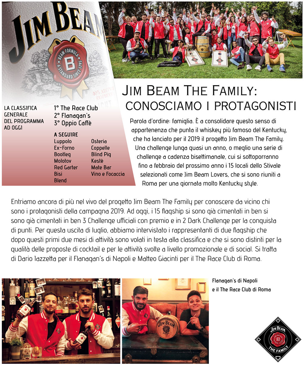- Leggi l'intervista-   - Ci descrivi il vostro locale e qual è la filosofia che lo ispira?- Il nostro The Race Club è un secret bar di Roma che si propone come punto di unione tra il presente e le vecchie tradizioni del passato del beverage. Il tutto in un’ambiente particolare, un’officina meccanica, arredata con materiali selezionati da noi stessi. Il nostro è un club unico, con un mood che non si trova da nessun’altra parte. - Cosa vi dà in più il fatto di far parte della community Jim Beam The Family?- Ci dà autenticità e passione, aspetti che rappresentano Jim Beam e che da 7 generazioni vengono tramandati nella Famiglia Beam per produrre questo Bourbon. - Whiskey Americani e Bourbon: i vostri pareri personali- Tutti i nostri bartender del The Race sono amanti dei whiskey. Teniamo in bottigliera molti più whisky che altri prodotti. Li proviamo e li degustiamo per trovare quelli giusti che esprimono i sentori che più si adattano alla nostra mixology. Secondo noi, tutti i locali di Roma dovrebbero avere Jim Beam: è buono da degustare ed è divertente lavorarci per creare i drink. - Una vostra proposta di signature cocktail Jim Beam Highball- Nella nostra signature list del The Race c’è un drink storico, creato molto tempo fa, il nostro cavallo di battaglia: il Tex Willer con Jim Beam. È un twist dell’Old Fashioned, dove oltre a 60 ml di Jim Beam, al posto della zolletta di zucchero c’è un honey mix, del liquore al fico, chocolate cookies al posto dell’angostura.